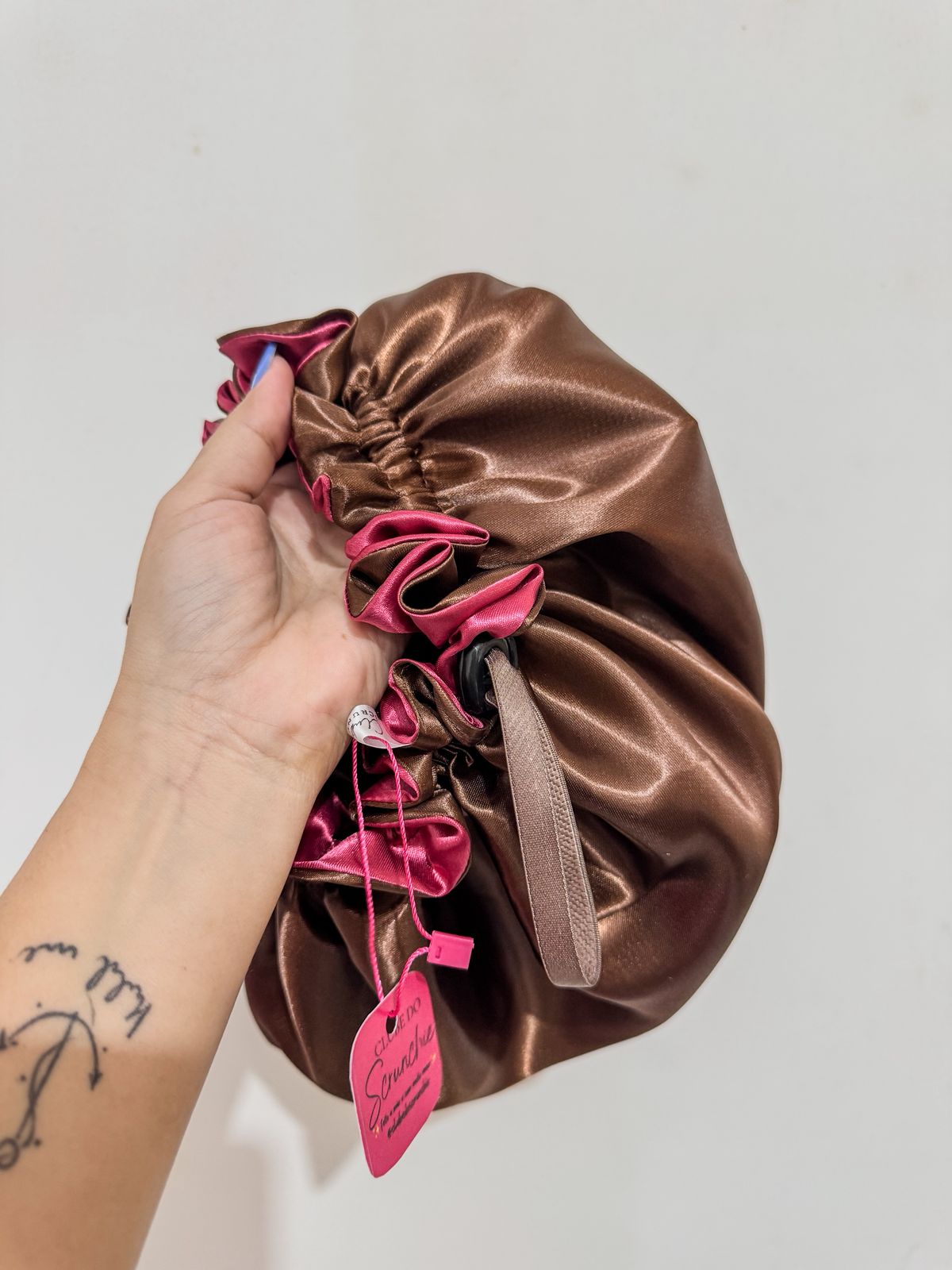 Touca de cetim dupla face nas cores capuccino/cereja regulável. A touca de cetim é uma poderosa aliada para prevenir o frizz e manter os cabelos alinhados e saudáveis.